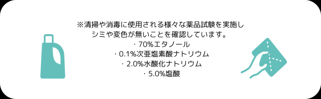 耐薬品性もある為、日々のお手入れや除菌・消毒などで変色せず安心してご使用いただけます。