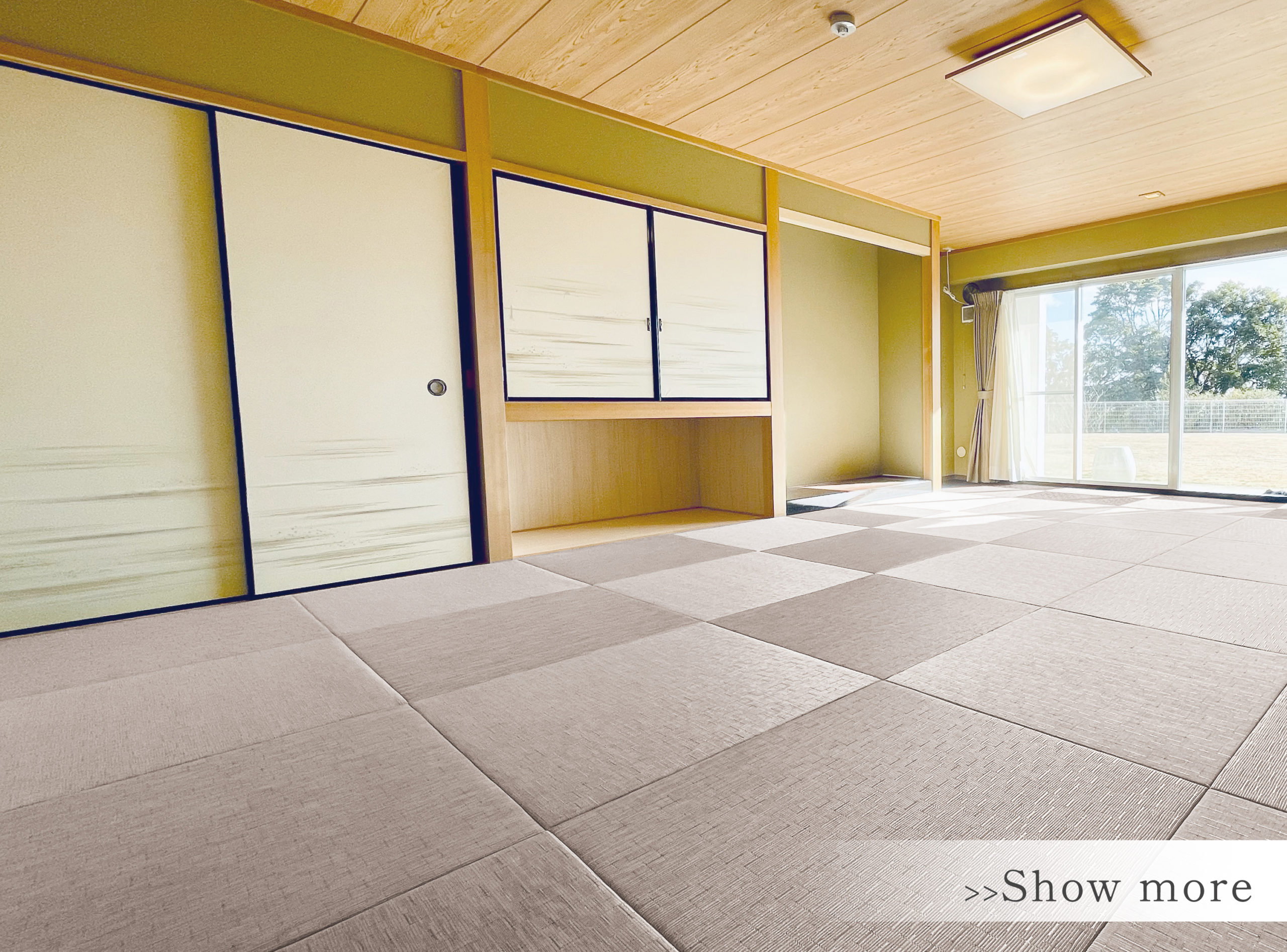 旅館など和風空間にも調和するデザインで、従来の畳で課題とされた擦り切れや変色などを解決し、サステナブルかつメンテナンスフリーを実現します。