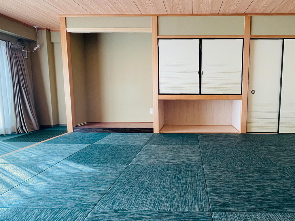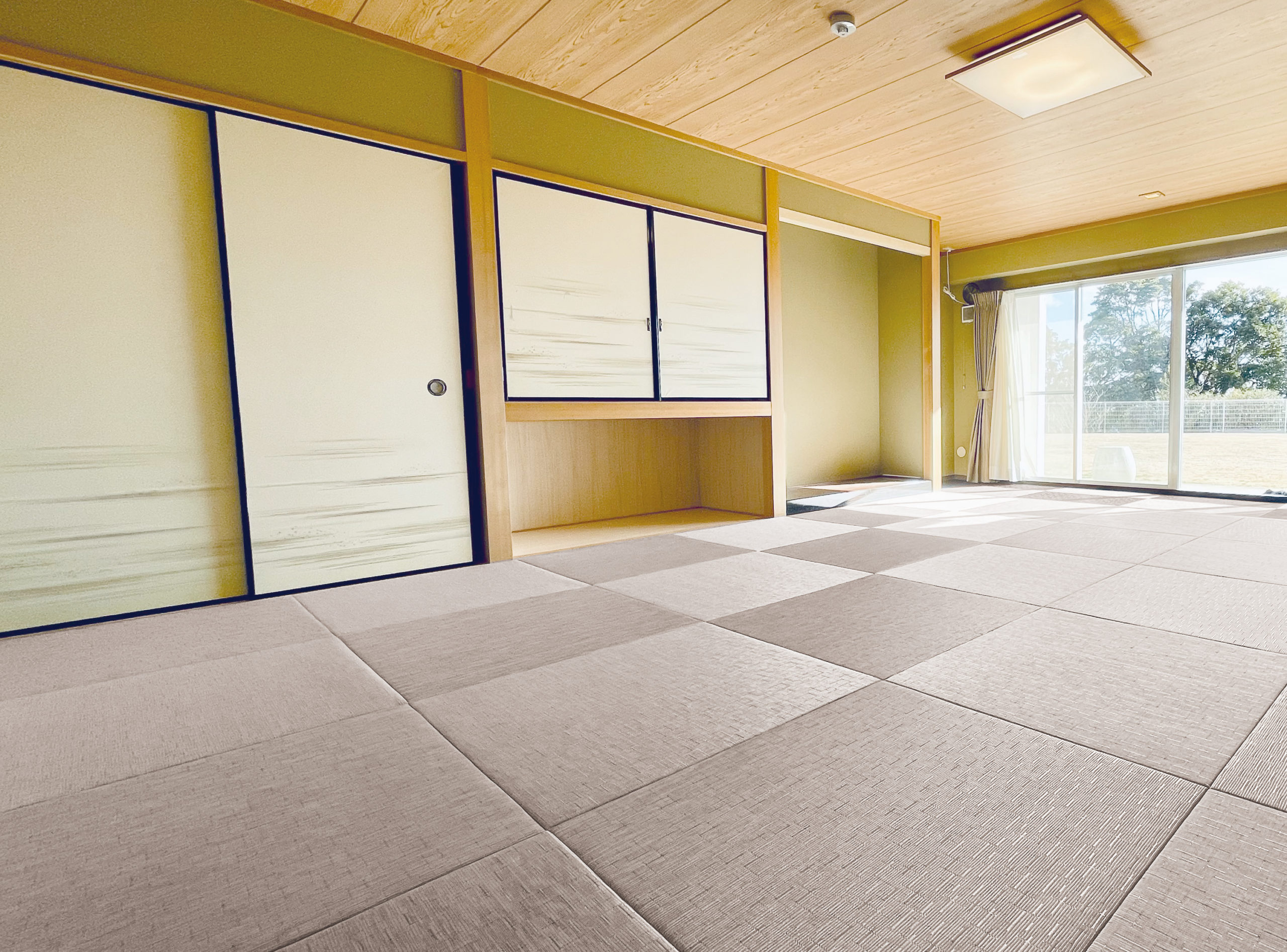 旅館など和風空間にも調和するデザインで、従来の畳で課題とされた擦り切れや変色などを解決し、サステナブルかつメンテナンスフリーを実現します。
