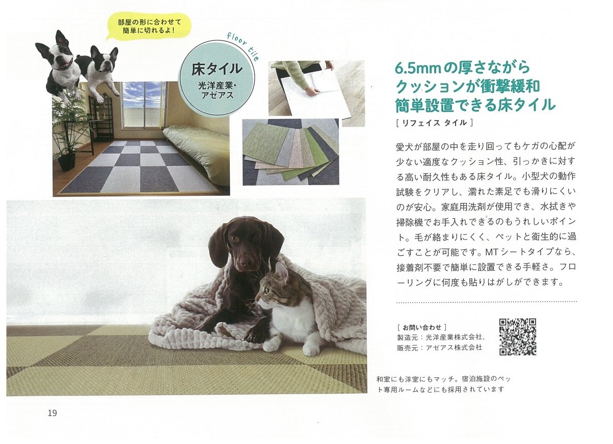 今回は「愛犬・愛猫にやさしい床特集」として様々なメーカーのペット向けの床材をクローズアップされており、ReFace® Tileもその1つとして紹介されています。